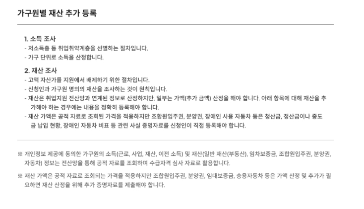 - 가구단위 증명서류: 가족관계증명서, 실종신고서