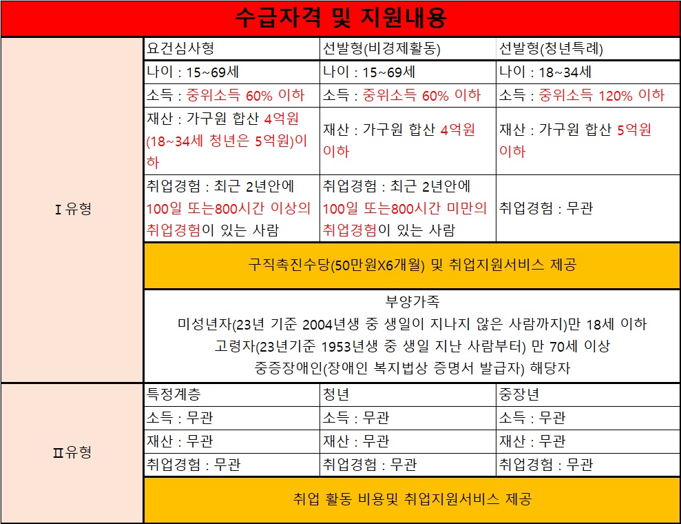 참여자의 소득과 재산 등에 따른 두 가지 지원 유형있습니다.