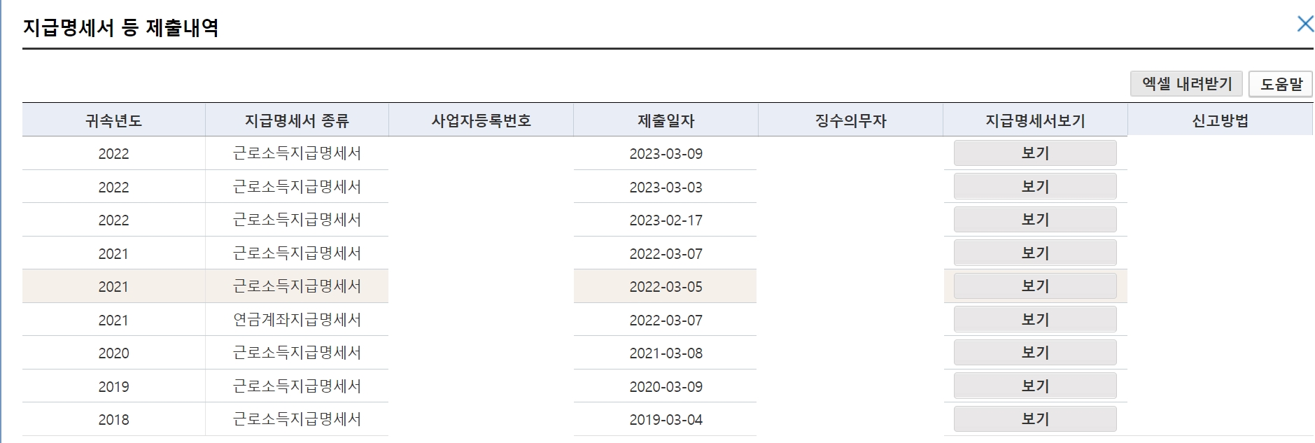 지급명세서의 종류와 징수 의무자(회사)를 보고 자신이 근무중인 회사를 확인하셔야 합니다.