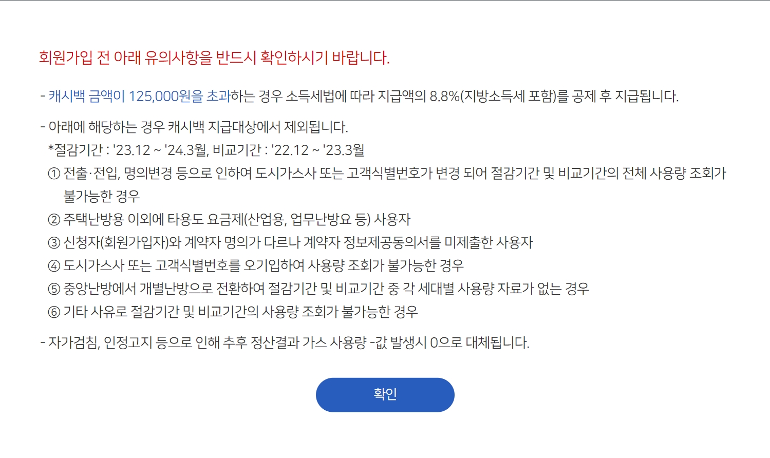 도시가스사 또는 고객식별번호를 잘못 입력할 경우 가스 사용량 조회가 불가능하기 때문에 캐시백 지급대상에서 제외됨을 유의하시기 바랍니다.