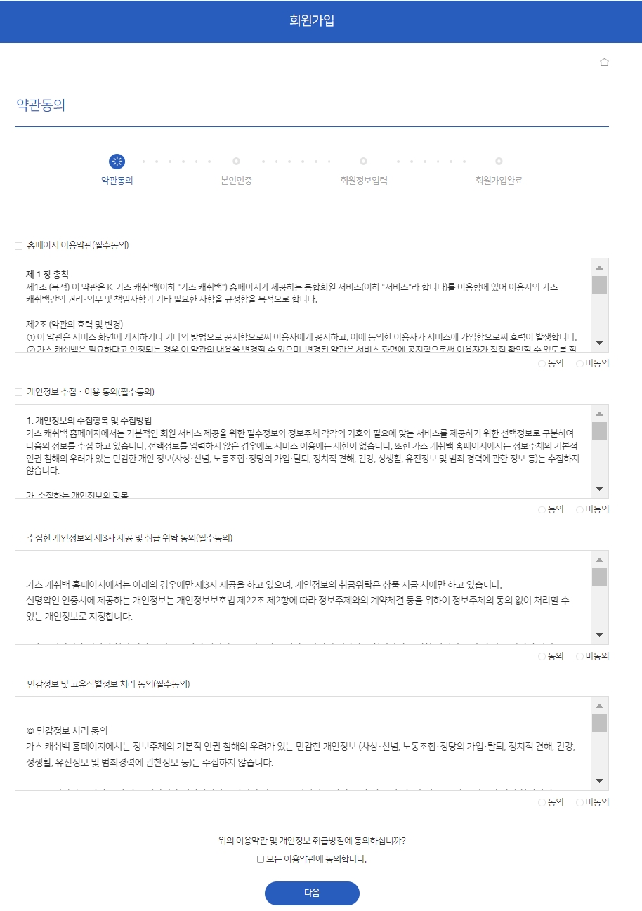 회원가입 과정은 약관동의-> 본인인증->회원정보입력-> 회원가입완료 순입니다.