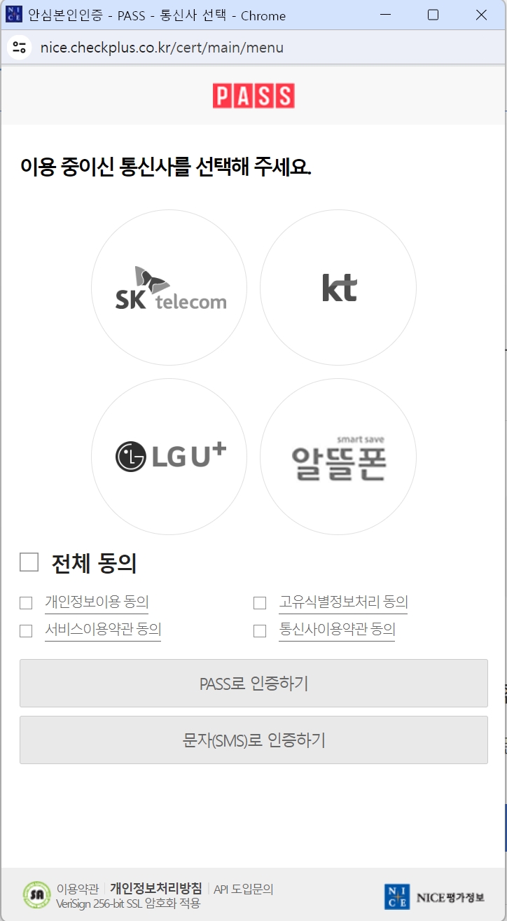 사용하시는 통신사를 클릭하시고 PASS 어플이 있으면 PASS어플로 인증을 하시면 되고
