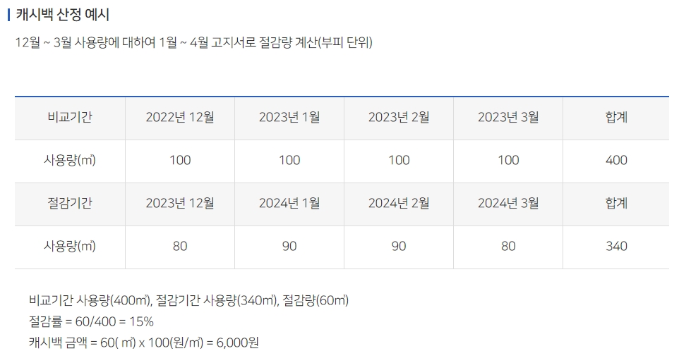 동안 전년도 사용량보다 3%*이상 절약하면 절감량에 따라 현금으로 돌려주는 제도입니다.(30%한도, 10원단위 절사)
