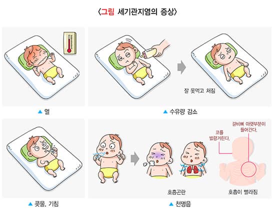 증상 발생 초기 2~3일 동안은 감기처럼 콧물,코막힘,미열,가벼운 기침 등을 보이다가 갑자기 빠른 호흡(60~80회/분),천명(쌕쌕거림,Wheezing),호흡곤란이 나타납니다.