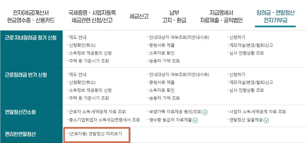 연말 정산 미리보기는 매년 10월의 마지막주에 국세청 홈택스에서 확인이 가능합니다.