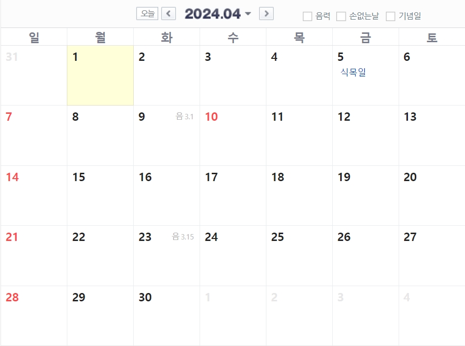 4월달은 예전에는 4월5일 식목일이 공휴일이었지만 2006년부터 공휴일에서 제외되어 사실상 공휴일이 없는 달입니다.